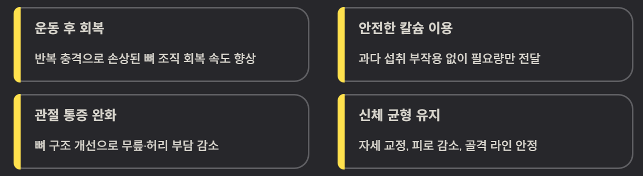 뼈 건강이 유지되면 몸의 틀 자체가 안정되어 자세 교정, 피로 감소, 골격 라인 유지에도 긍정적인 영향을 줄 수 있습니다.