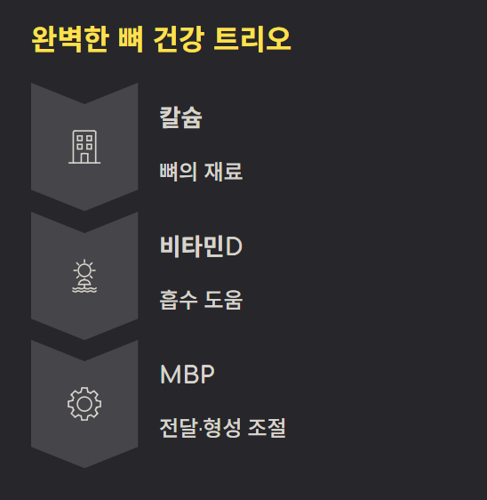 - 칼슘은 뼈의 재료, 비타민D는 흡수 도움, MBP는 전달·형성 조절 역할