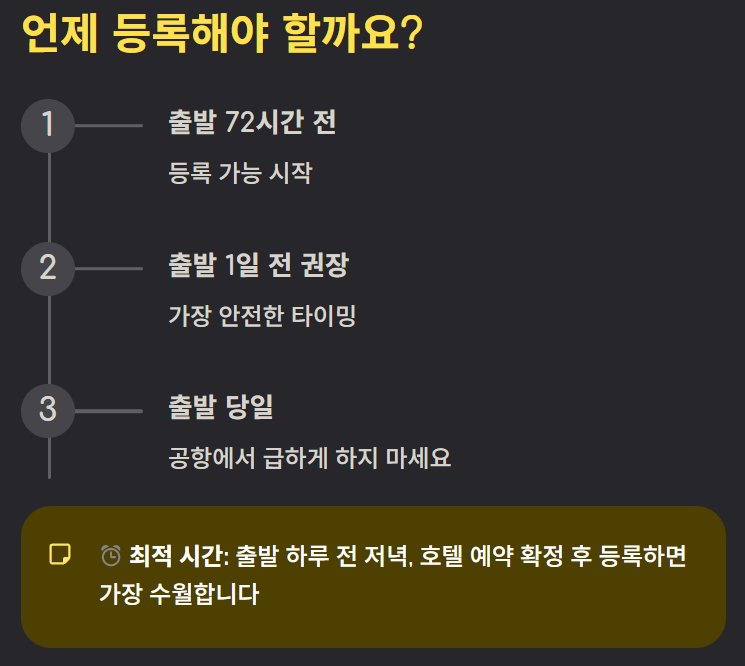 필리핀 정부는 출발일 기준 72시간 전부터 등록 가능하다고 안내합니다. 대부분 여행자는 출발 하루 전에 등록하면 가장 수월합니다. 너무 일찍 하면 시스템 오류나 정보 변경 위험이 있고, 공항에서 급하게 하면 모바일 인증이 불편할 수 있기 때문입니다.
