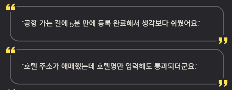 - “공항 가는 길에 5분 만에 등록 완료해서 생각보다 쉬웠어요.”