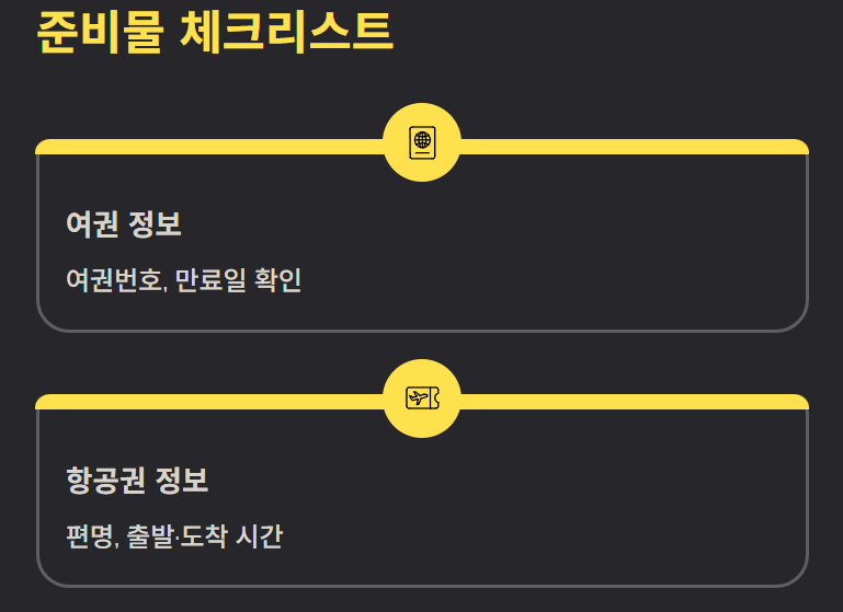 eTravel 등록은 어렵지 않지만 미리 아래 정보를 준비해두면 속도가 빨라집니다.