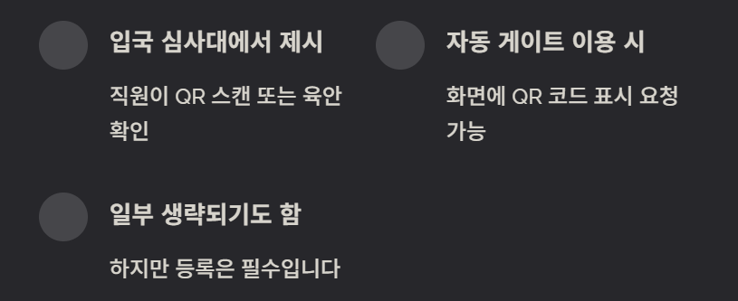 입국 심사대에서 직원이 QR을 스캔하거나, 자동 게이트 이용 시 확인을 요청할 수 있습니다. 대부분의 경우 QR을 보여주기만 하면 통과됩니다. 일부 공항에서는 QR 확인을 생략하는 경우도 있지만, 미등록자는 입국이 지연될 수 있으므로 반드시 등록해야 합니다.