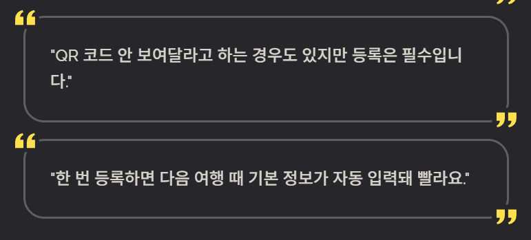 - “한 번 등록하면 다음 여행 때 기본 정보가 자동 입력돼 빨라요.”