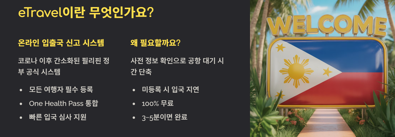 필리핀 여행 전 반드시 준비해야 하는 것 중 하나가 바로 필리핀 eTravel(이트래블) 등록입니다. 예전에는 One Health Pass나 eArrival Card 등으로 불리던 이 절차가 현재는 eTravel로 통합되며 훨씬 간단해졌습니다.