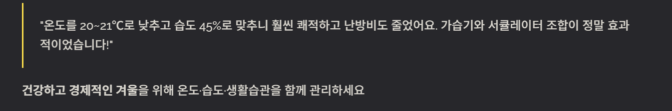 “예전엔 집을 무조건 따뜻하게 해야 한다고 생각해서 24~25℃까지 올려두곤 했는데, 공기가 건조하고 난방비 부담도 커서 힘들었어요. 이번에 온도를 20~21℃로 낮추고 습도 45% 정도로 맞추니까 훨씬 쾌적하고 난방비도 줄었습니다. 특히 가습기와 서큘레이터 조합이 체감효과가 좋았어요.”