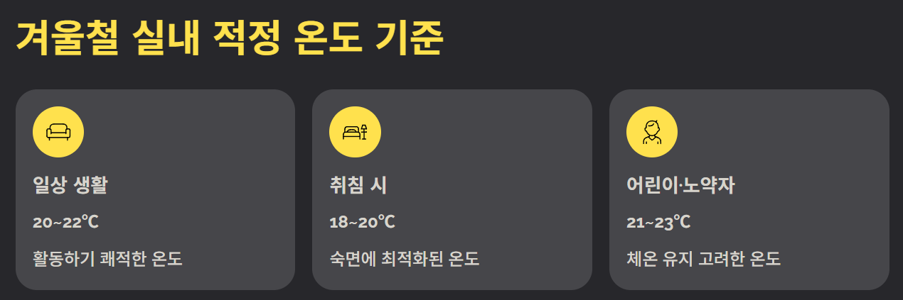 겨울철 실내 적정 온도는 18~22℃, 습도는 **40~60%**입니다. 가장 중요한 것은 온도·습도를 함께 관리하며 난방비까지 고려하는 균형 잡힌 관리입니다. 단순히 온도를 올리는 것보다 단열·습도·생활 습관까지 종합적으로 관리해야 건강하고 경제적인 겨울을 보낼 수 있습니다.