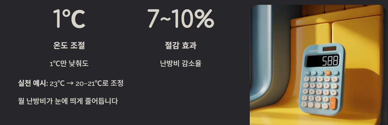 실내 온도를 1℃만 낮춰도 난방비가 약 7~10% 절약된다는 점은 잘 알려져 있습니다. 예를 들어 평소 23℃를 사용한다면 20~21℃로 낮추는 것만으로도 월 난방비가 눈에 띄게 줄어듭니다.