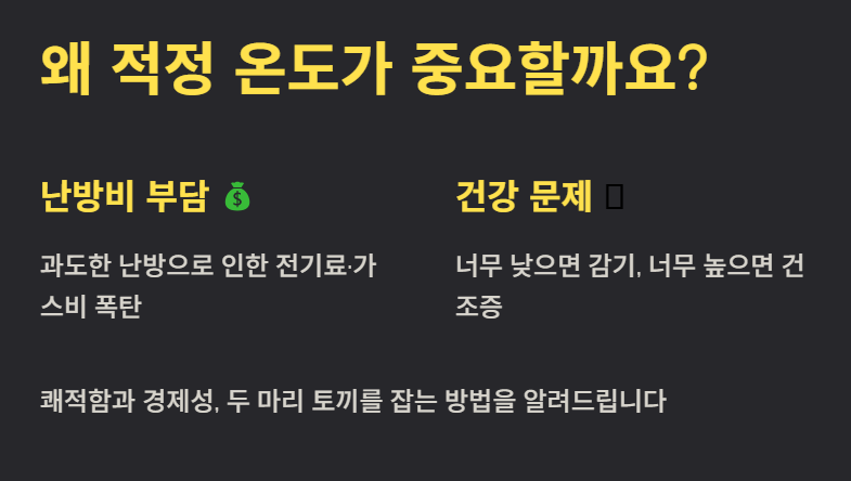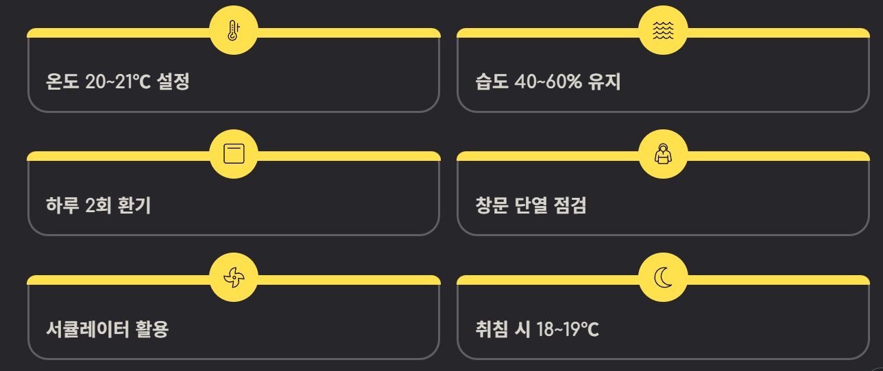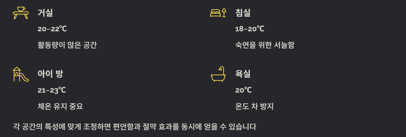 - 침실: 지나친 난방은 숙면 방해 → 18~20℃