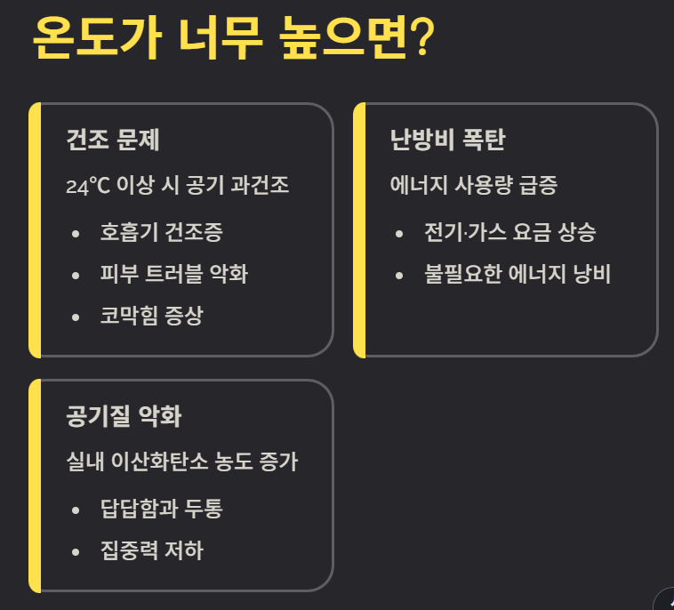 반대로 24℃ 이상으로 난방을 올리면 공기가 지나치게 건조해져 호흡기 건조·피부 트러블·코막힘 등이 생길 수 있습니다.