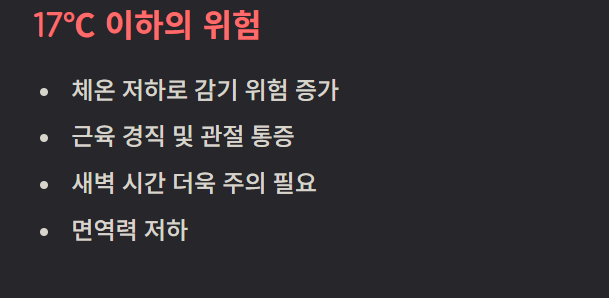 실내가 17℃ 이하로 떨어지면 체온이 쉽게 낮아져 감기, 근육 경직, 관절 통증 위험이 증가할 수 있습니다. 특히 새벽 시간에는 실내 온도가 더 떨어지기 때문에 취침 환경이 너무 차갑지 않도록 조절이 필요합니다.