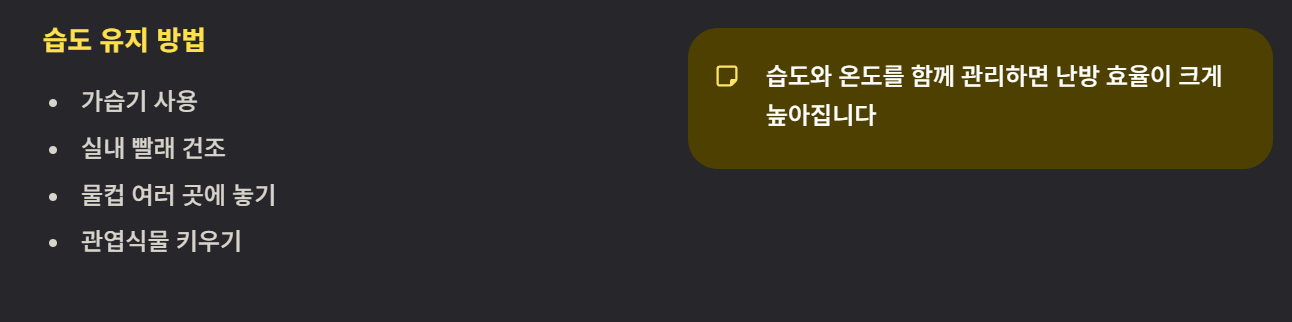 겨울 실내 습도는 **40~60%**가 적정입니다. 습도가 적절하면 같은 온도에서도 훨씬 따뜻하게 느껴집니다. 가습기·빨래건조·물컵 놓기 등 간단한 방법만으로도 체감온도를 2~3℃ 높일 수 있습니다.