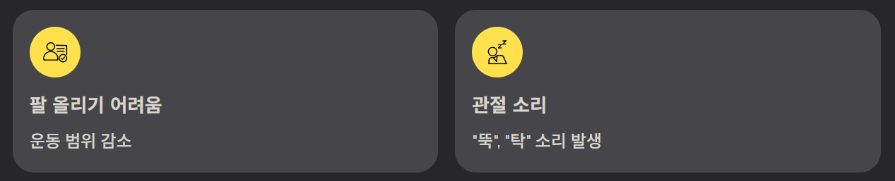 팔을 위로 들어 올릴 때 걸리는 느낌, 힘이 빠지는 느낌이 나타납니다. 한 손으로 머리를 감기 어렵거나 선반 위 물건을 꺼내는 동작이 힘들어지는 것이 대표적인 증상입니다.