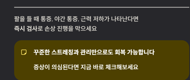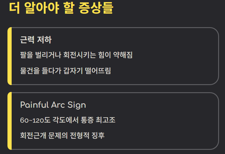 팔을 60~120도 사이로 들어 올릴 때 통증이 가장 심해지는 **“Painful Arc Sign”**이 회전근개 문제의 전형적인 징후입니다.