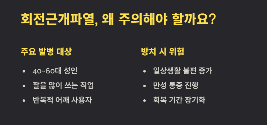 회전근개파열은 어깨 통증의 대표 원인으로, 특히 팔을 사용하는 직업이나 40~60대에서 많이 발생합니다.