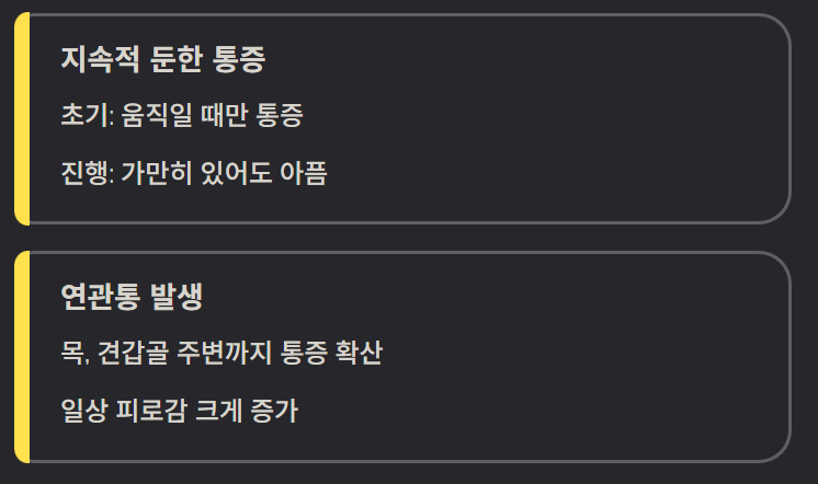 초기에는 단순 근육통처럼 느껴지지만 방치하면 일상생활이 불편해지고 만성 통증으로 이어질 수 있어 조기 확인이 중요합니다.