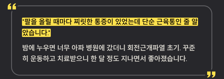 - “팔을 올릴 때마다 찌릿한 통증이 있었는데 단순 근육통인 줄 알았습니다. 하지만 밤에 누우면 너무 아파 병원에 갔더니 회전근개파열 초기라고 하더군요. 꾸준히 운동하고 치료받으니 한 달 정도 지나면서 좋아졌습니다.”