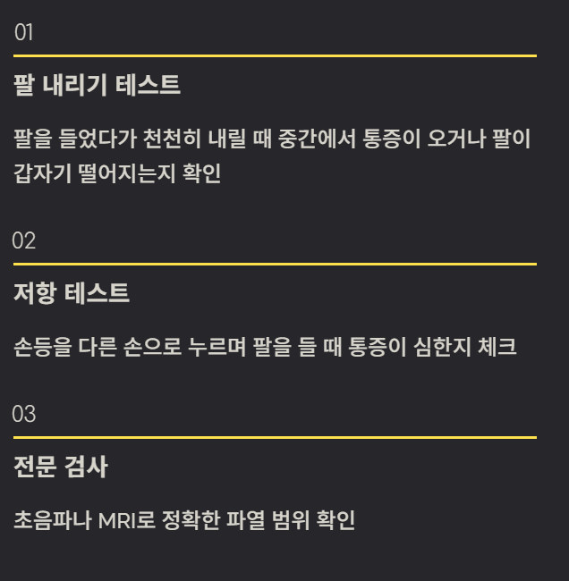 팔을 좌우로 들어 올렸다가 천천히 내릴 때 중간에서 통증이 오거나 팔이 갑자기 떨어지면 의심됩니다. - 저항 테스트
