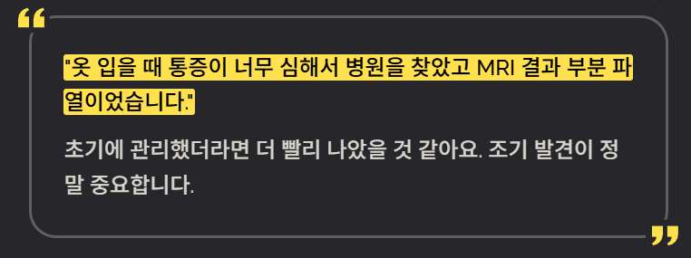- “옷 입을 때 통증이 너무 심해서 병원을 찾았고 MRI 결과 부분 파열이었습니다. 초기에 관리했더라면 더 빨리 나았을 것 같아요.”