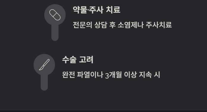 통증이 심하면 소염제나 주사치료가 도움이 될 수 있습니다. - 파열 정도가 심하면 수술 고려