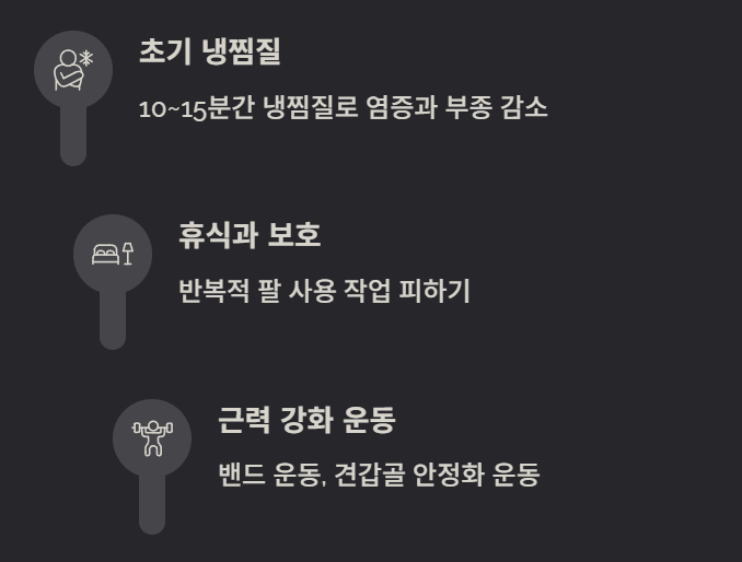 회전근개 주변 근육을 강화하는 밴드 운동, 견갑골 안정화 운동이 회복에 도움됩니다. - 약물·주사치료(전문의 상담 필요)