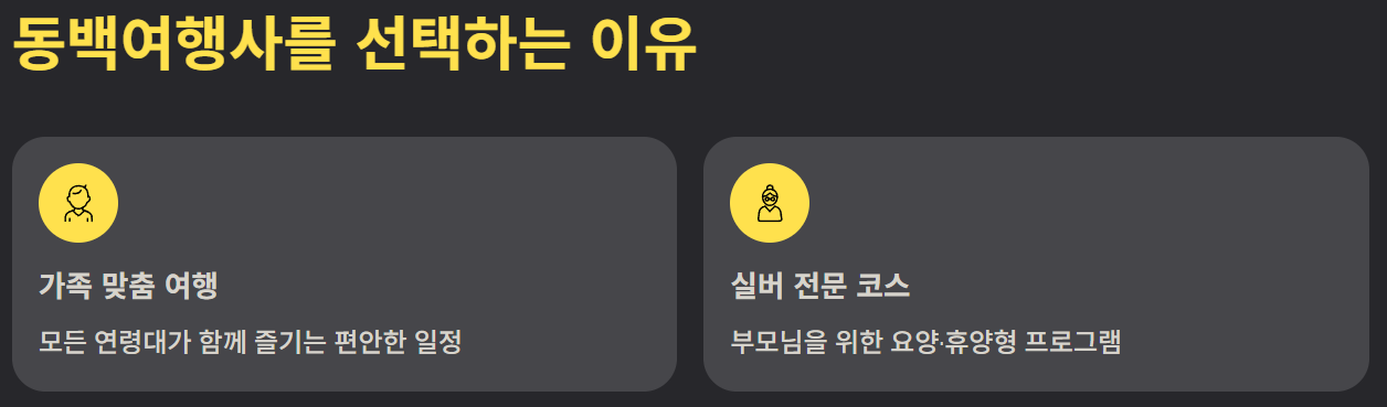 동백여행사는 다양한 연령층을 위한 맞춤형 여행 패키지를 운영하는 여행사로, 특히 가족 여행·실버 여행·단체 관광에 강점을 가진 것으로 알려져 있습니다.