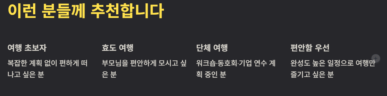 일정의 완성도, 가이드 전문성, 이동 편의성 등을 강화해 초보 여행객도 안심하고 이용할 수 있다는 장점이 있습니다.