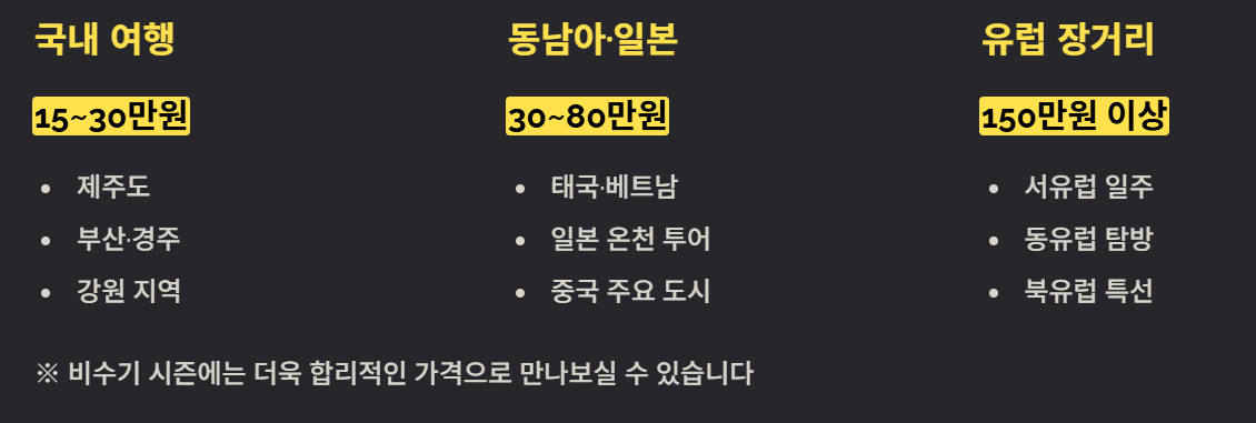 상품에 따라 가격 차이가 크지만, 전반적으로 동남아 30~60만 원대, 일본 40~80만 원대, 유럽 150만 원 이상, 국내 패키지 15~30만 원대 등으로 형성돼 있으며 비수기 상품은 더욱 저렴한 편입니다.