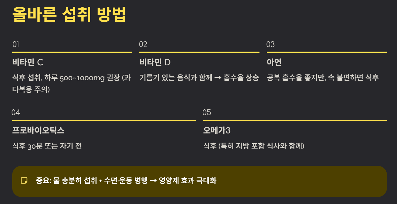 - 비타민 C → 식후 섭취, 하루 500~1000mg 권장(과다복용 주의)