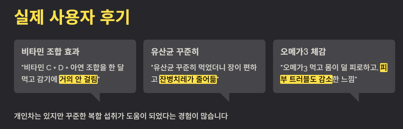 - “비타민 C + D + 아연 조합을 한 달 먹고 감기에 거의 안 걸림.”