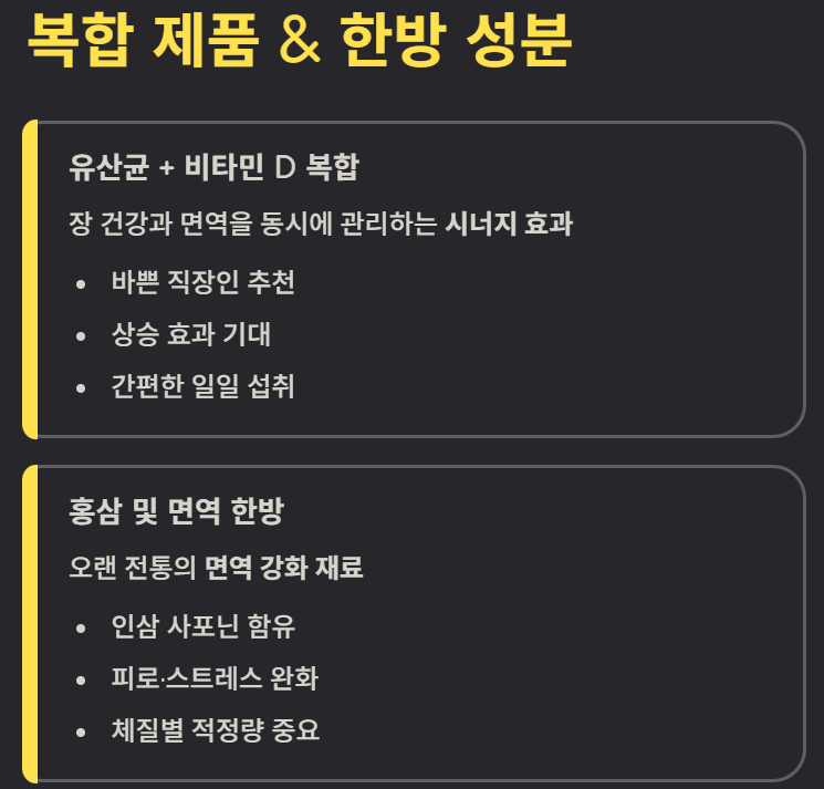 최근에는 장 건강 + 면역을 동시에 챙길 수 있는 복합 영양제가 인기입니다. 유산균과 비타민 D를 함께 섭취하면 면역 강화의 상승 효과를 기대할 수 있어 바쁜 직장인에게 추천되는 방식입니다.