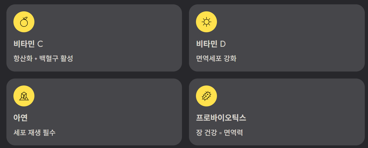 - 물 충분히 섭취 → 면역 활동을 돕는 기본 관리