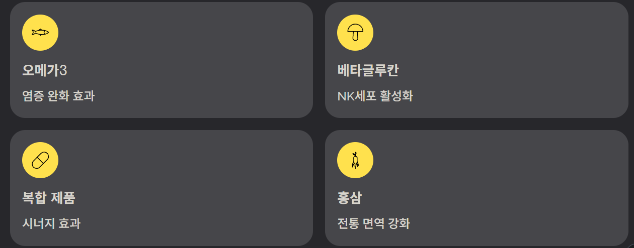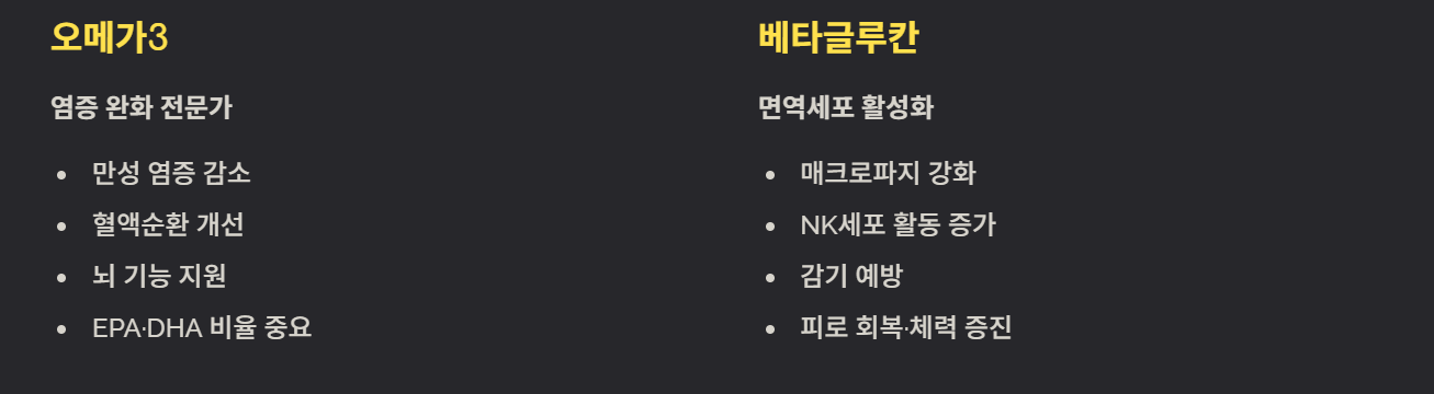 베타글루칸은 버섯류나 효모에서 추출되는 성분으로 면역세포(매크로파지, NK세포)의 활성도를 높이는 데 유효합니다. 감기 예방, 피로 회복, 체력 증진을 원하는 사람들이 자주 선택하는 성분입니다.