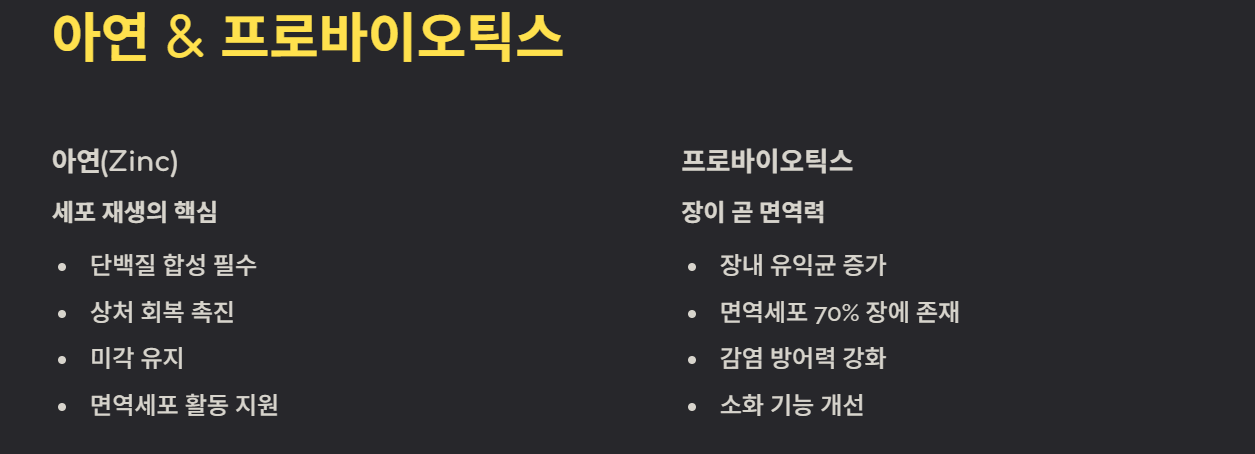 아연은 단백질 합성, 세포 재생은 물론 면역 기능 유지에 필수입니다. 부족하면 상처 회복이 느려지고 감염에 취약해지며 맛을 못 느끼는 미각저하가 올 수 있습니다. 특히 면역세포 활동을 활성화하는 핵심 미네랄로 알려져 있습니다.