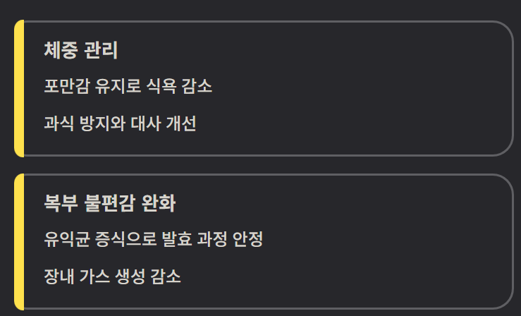 포만감을 오래 유지해 식욕 감소, 과식 방지에 도움을 줍니다. 장내 미생물 균형을 통해 대사 개선도 기대할 수 있습니다.