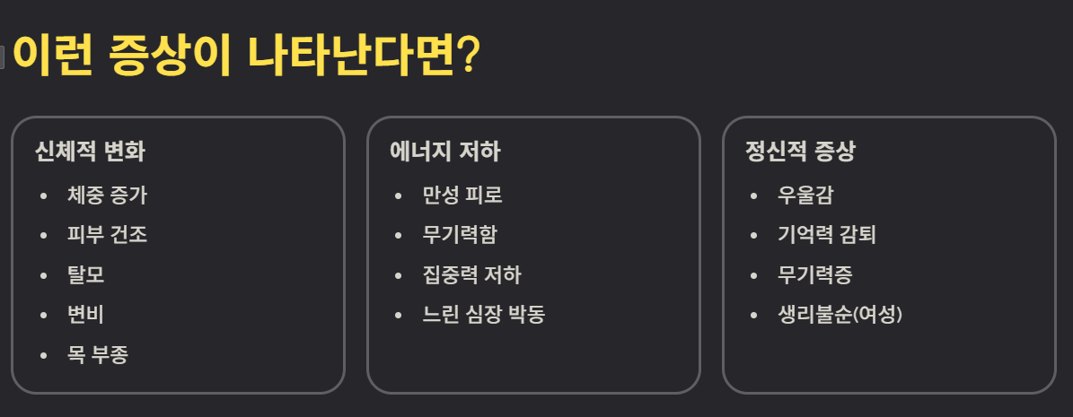 갑상선기능저하증의 초기 증상은 미미하게 나타나지만, 점차 체중 증가, 피로, 변비, 피부 건조, 탈모, 우울감 등이 동반됩니다. 특히 여성은 생리불순이 나타날 수 있으며, 심한 경우 심장 박동이 느려지고 목 부종이 발생할 수도 있습니다.