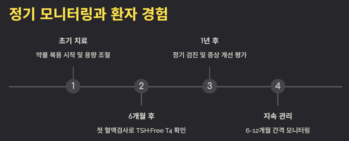 치료 후에도 정기적인 혈액 검사를 통해 호르몬 수치를 모니터링해야 합니다. TSH와 Free T4 수치를 6~12개월 간격으로 확인하며, 증상 변화가 있으면 즉시 조정이 필요합니다.