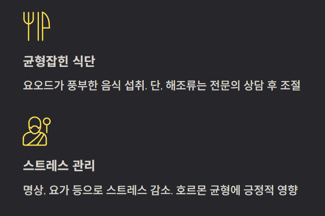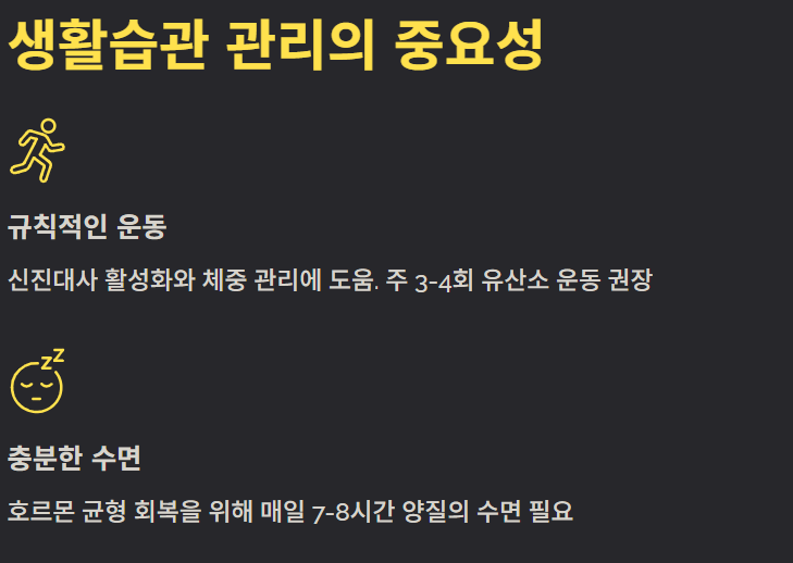약물치료 외에도 생활습관 개선이 중요합니다. 규칙적인 운동, 충분한 수면, 스트레스 관리가 필요하며, 요오드가 풍부한 식단을 섭취하는 것이 좋습니다. 단, 갑상선 질환이 있는 경우 일부 해조류나 보충제는 전문의 상담 후 섭취해야 합니다.