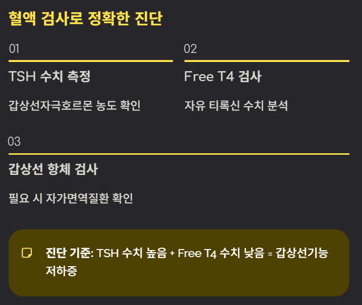 갑상선기능저하증은 혈액 검사를 통해 진단합니다. 주요 검사 항목으로는 **TSH(갑상선자극호르몬)**와 **Free T4(자유 티록신)**가 있으며, 필요 시 갑상선 항체 검사도 시행합니다. TSH 수치가 높고 Free T4 수치가 낮으면 갑상선 기능 저하로 판단할 수 있습니다.