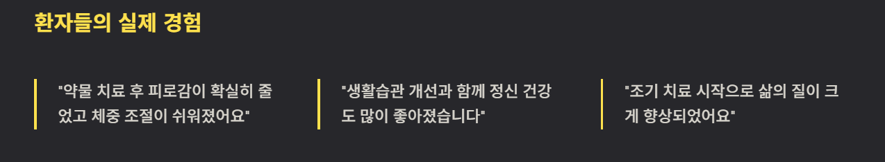 많은 환자들이 약물 복용과 생활습관 개선 후 피로감이 줄고 체중 조절이 쉬워졌다, 정신 건강이 개선되었다고 보고합니다. 초기 증상을 무시하지 않고 조기 치료를 시작하면 삶의 질을 크게 향상시킬 수 있습니다.