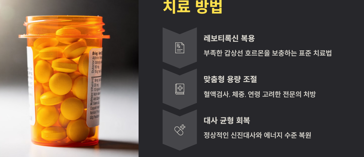 갑상선기능저하증의 표준 치료법은 레보티록신(Levothyroxine) 복용입니다. 부족한 갑상선 호르몬을 보충함으로써 체내 대사 균형을 회복할 수 있습니다. 복용량은 개인의 혈액검사 수치, 체중, 연령 등을 고려해 전문의가 조정합니다.