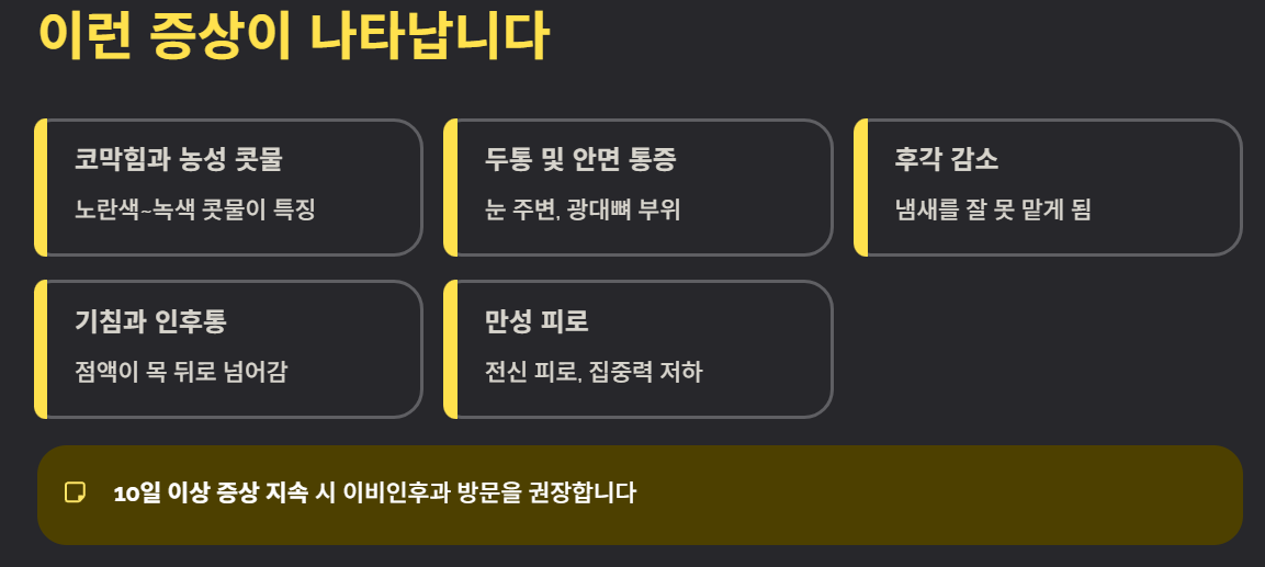 - 코막힘과 콧물: 주로 농성 콧물(노란색~녹색)이 특징입니다.