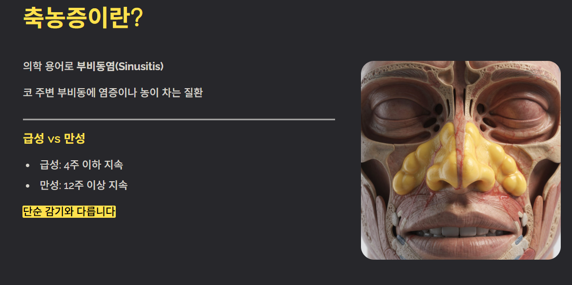 축농증, 의학적으로는 **부비동염(Sinusitis)**이라고 불리며, 코 주변의 부비동(코 옆 빈 공간)에 염증이나 농이 차는 질환입니다. 단순 감기와 혼동하기 쉽지만, 치료 시기를 놓치면 만성화되어 삶의 질을 크게 떨어뜨립니다. 최근 환자 수가 증가하면서 축농증에 대한 관심과 치료 방법 문의가 늘고 있습니다.