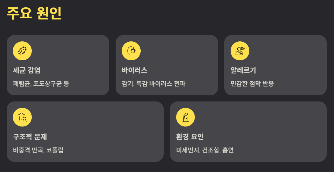 - 세균 감염: 폐렴균, 포도상구균 등 세균 감염이 가장 흔한 원인입니다.