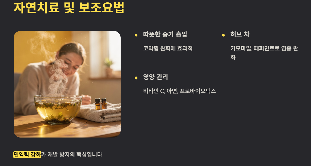 - 영양 관리: 비타민 C, 아연, 프로바이오틱스 섭취로 면역력 강화 가능.