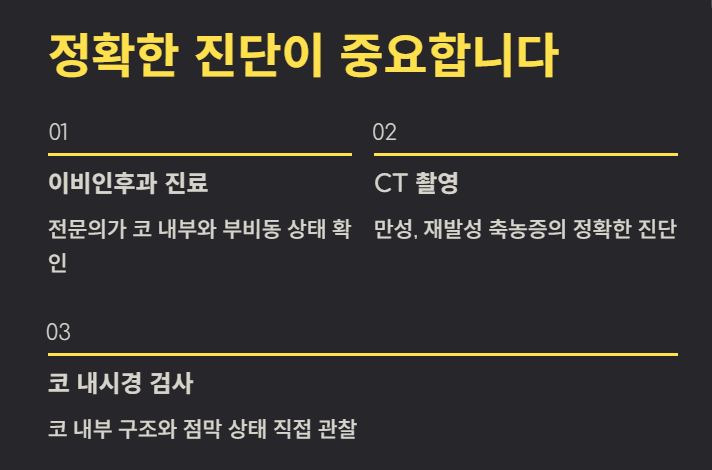- 이비인후과 진료: 전문의가 코 내부와 부비동 상태를 확인합니다.