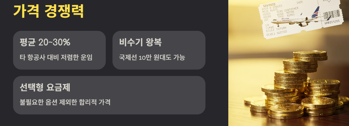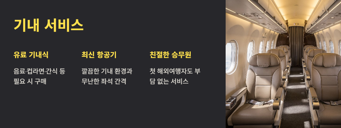 또한 불필요한 기내식·좌석 옵션을 직접 선택하도록 하여 합리적인 요금제를 제공하는 것이 특징입니다.