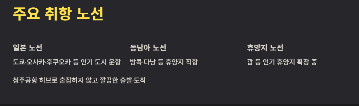 에어로케이는 현재 도쿄·오사카·후쿠오카 등 일본 노선, 방콕·다낭 등 동남아 노선, 그리고 괌 등 휴양지 노선으로 꾸준히 취항 범위를 넓히고 있습니다. 청주공항을 허브로 삼기 때문에 서울 출발보다 혼잡하지 않고, 출발·도착 시간이 깔끔하다는 장점이 있습니다.