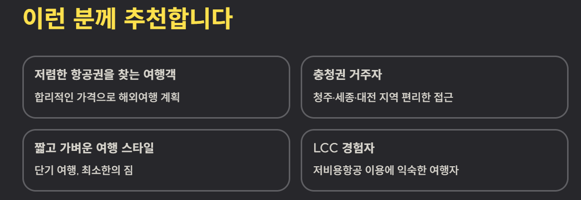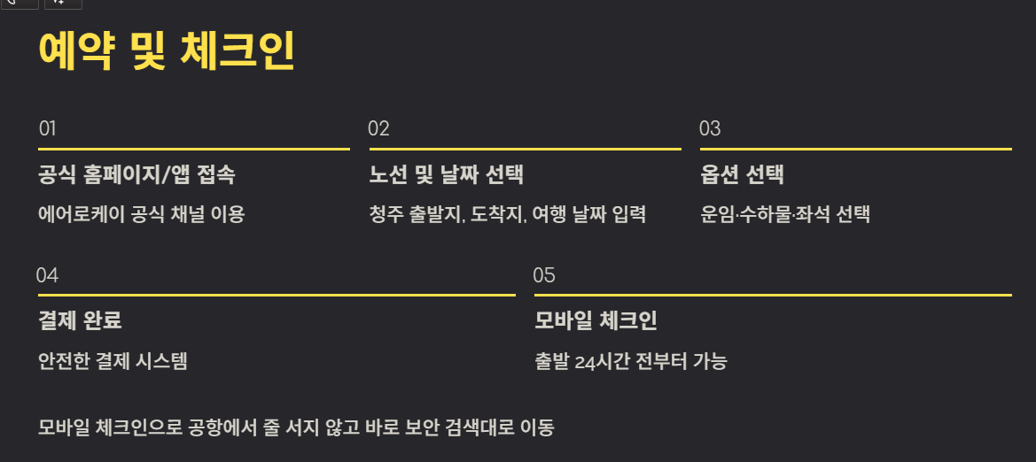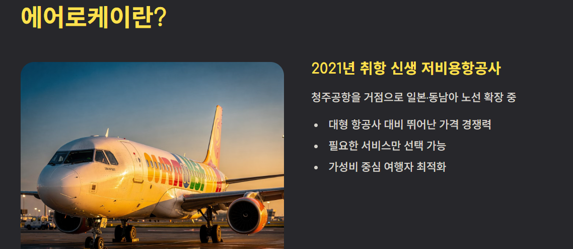 에어로케이는 최신 기재를 기반으로 저렴한 가격과 간편한 시스템을 갖춘 매우 실용적인 항공사입니다. 청주공항 중심으로 운영되기 때문에 수도권 대비 혼잡함이 적고, 여유로운 출발이 가능하다는 점에서도 높은 만족을 얻고 있습니다.