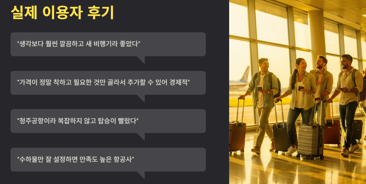 단점으로는 노선이 아직 타 항공사만큼 다양하지 않다는 의견이 있습니다. 하지만 일본·동남아 중심 여행객에게는 충분히 매력적인 선택지입니다.