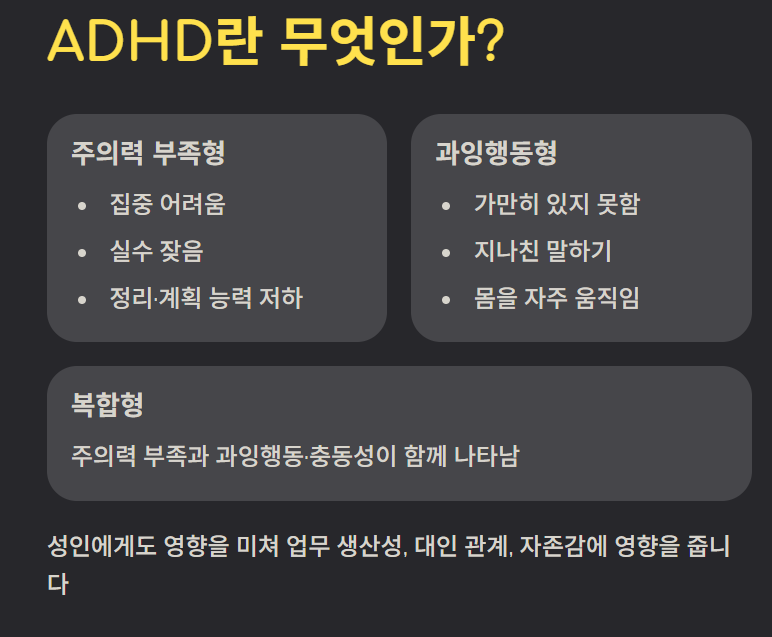 어린이뿐 아니라 성인 ADHD도 흔히 나타나며, 집중력 저하·정서 조절 어려움·업무 및 학습 효율 저하 등 삶 전반에 영향을 줄 수 있습니다.